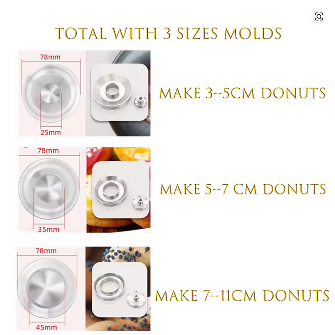 Versatile Mould Sizes:Includes 3 sets of moulds (25mm, 35mm, 45mm) for diverse donut sizes.