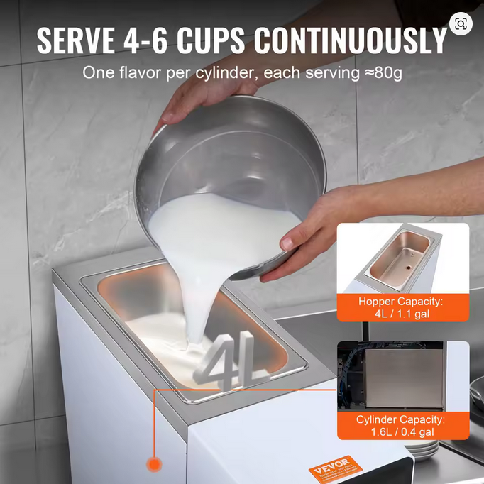 - Rapid Freeze with Powerful Cooling: Featuring a robust compressor and a 4L/4.2 Qt hopper, this commercial ice cream machine achieves rapid cooling. Initial freeze time is just 15 minutes, with subsequent batches ready in 6 minutes or less, ensuring a continuous supply.