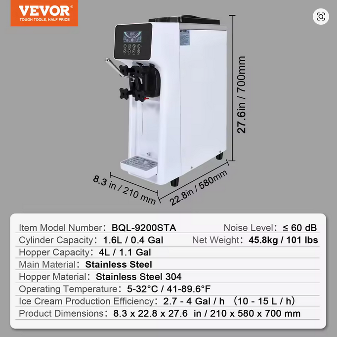 - Solid and Durable: Constructed with high-quality SUS201 stainless steel and featuring a food-grade SUS304 stainless steel cylinder, the soft serve commercial ice cream maker is sturdy, rust-resistant, and easy to clean, ensuring longevity and food safety.