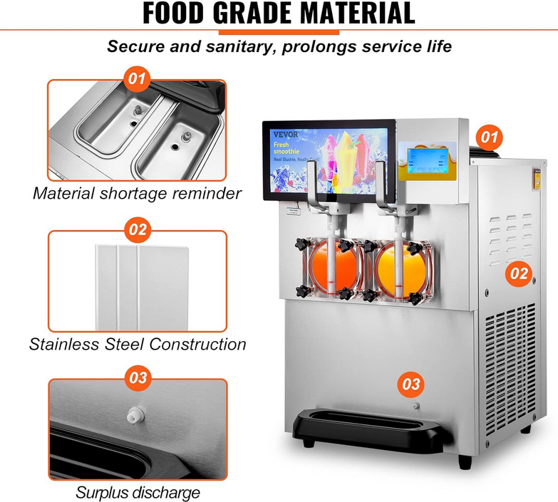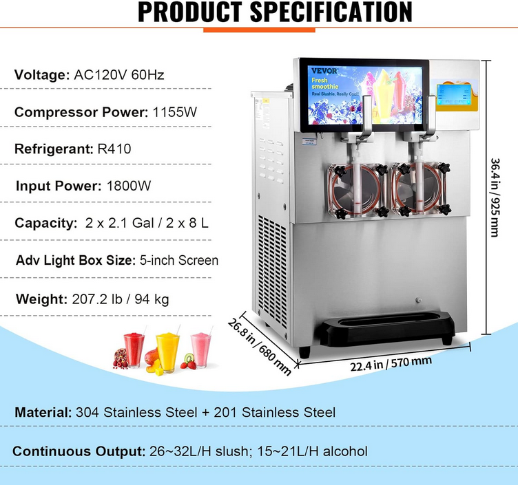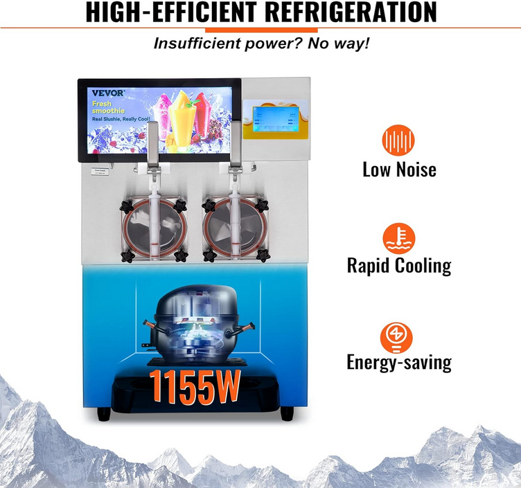 - Rapid Refrigeration & Blending: Our refrigeration system has excellent features for fast cooling and efficient slush production, specially designed for the business of summer frozen drinks. The 1155W powerful compressor has fast cooling capabilities that are energy saving while maintaining a quiet operation.