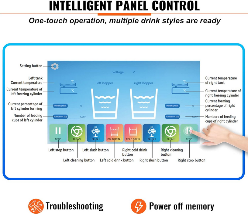 - Precise Control Panel: This slushie machine is equipped with an easy-to-operate panel. Each bowl can be operated independently, with a clear digital display at a glance. Adjusting the thickness according to your needs has never been easier. The simple one-touch operation allows serving your favorite frozen drinks. There are also thoughtful settings for fault diagnosis and power failure memory.